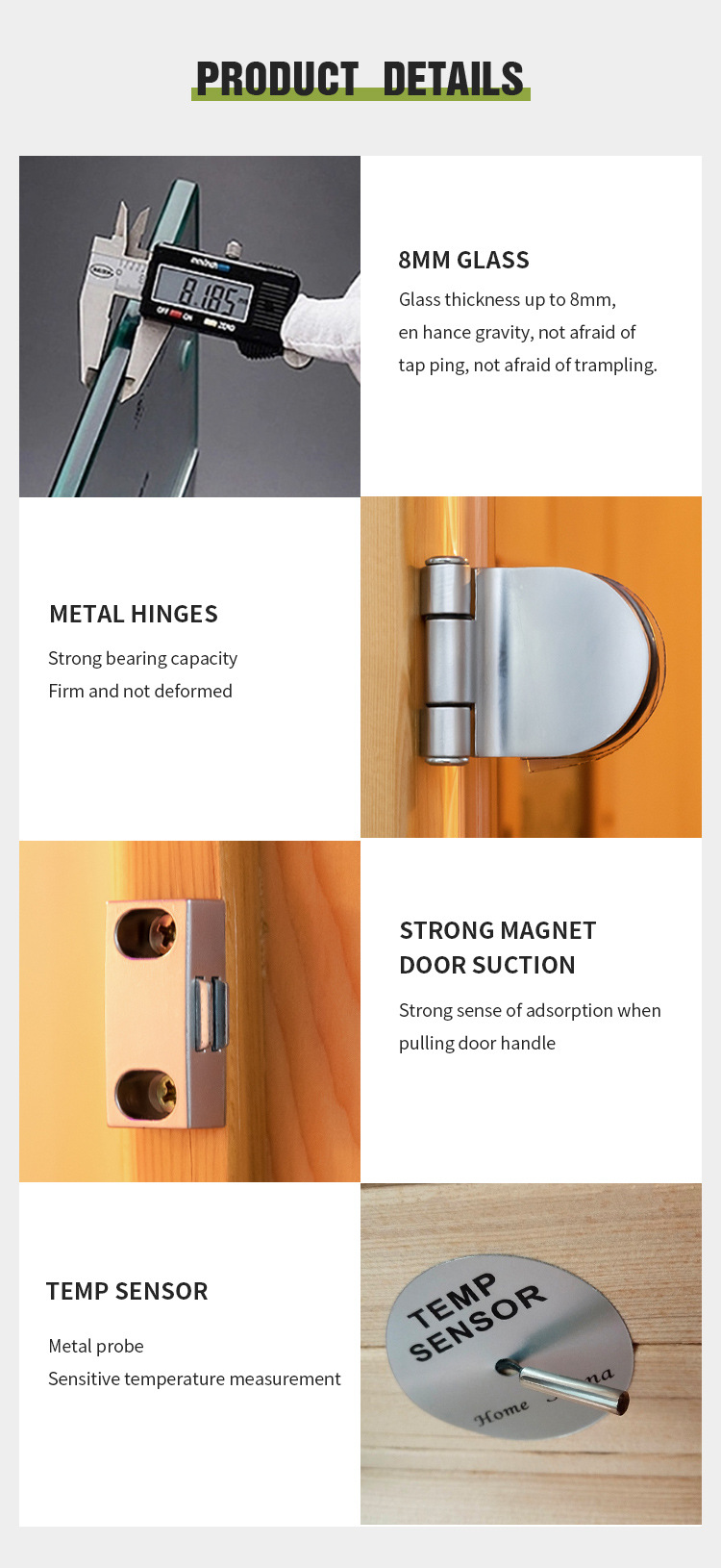 Kính cường lực 8MM: Như trong chi tiết sản phẩm, Phòng xông hơi hồng ngoại và xông hơi gỗ dành cho 1-3 người có kính cường lực dày 8mm. Nó tự hào có độ bền đặc biệt, tăng cường khả năng chống trọng lực. Bạn không phải lo lắng về việc chạm hoặc giẫm đạp – nó được thiết kế để chịu được việc sử dụng hàng ngày.
