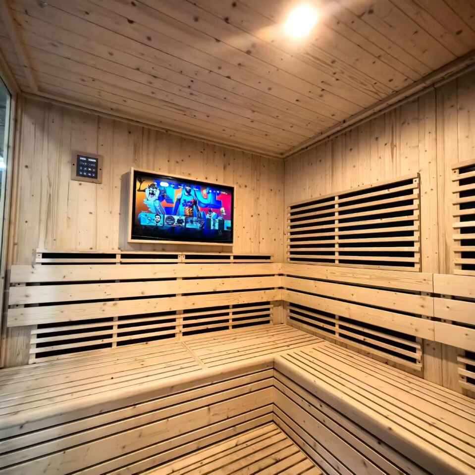 TV LCD tích hợp (có thể nhìn thấy trong hình ảnh) làm thay đổi trải nghiệm xông hơi: