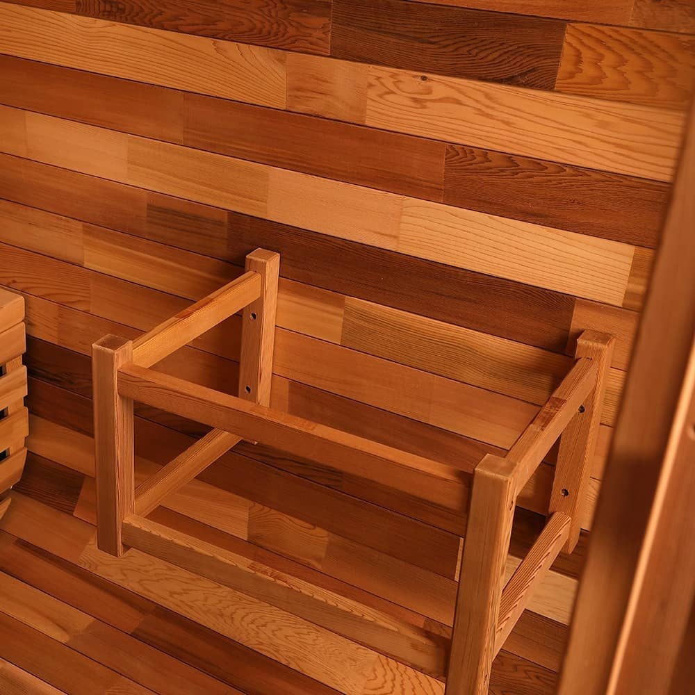 - Chất liệu chính: Gỗ đặc chịu nhiệt cao cấp được sử dụng xuyên suốt (tường, ghế, khung đều là gỗ nguyên khối), được xử lý chống ẩm, chịu nhiệt chuyên nghiệp để thích ứng với môi trường xông hơi có nhiệt độ, độ ẩm cao.
